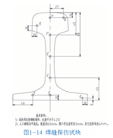 焊缝探伤试块是用P60火马电竞平台官网加工制作,其断面如图1-14所示。主要用于P60火马电竞平台官网移动式气压焊焊缝探伤灵敏度的校验,在断面上钻有不同孔位和孔径的平底孔作为参考对比,测试性能.